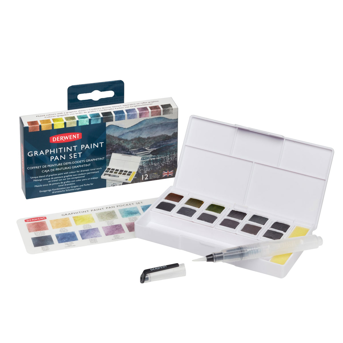 Derwent Graphitint Paint Pan -paletti täydentää upeasti Derwentin Graphitint-grafiittikynien sarjaa. Grafiittivärit ovat ainulaatuinen yhdistelmä hienoksi jauhettua grafiittia sekä pigmenttejä. Päästessään kosketuksiin veden kanssa tummanpuhuvat värinapit muuttuvat monivivahteisiksi, elinvoimaisiksi väreiksi, jotka tuottavat kauniin, murretun väriskaalan. Lopputuloksessa näkyy grafiitille tyypillinen herkkyys, hehku ja hienovarainen kimallus. Parhaiten värit pääsevät esille sileäpintaisella akvarellipaperilla.