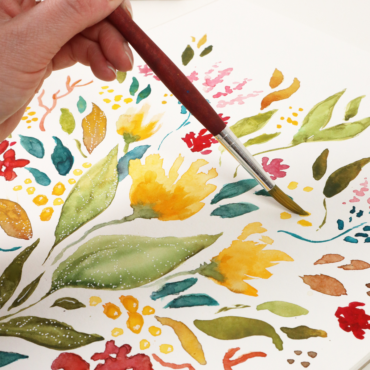 Huomaa! Paletin G-kirjaimella merkityt värit sisältävät granuloivia ominaisuuksia, eli kuivuessaan väri muodostaa paperin pintaan hiekkamaisia hiukkasia, jotka voivat tuoda teokseen mielenkiintoista tekstuuria ja syvyyttä. Tällaisia värejä on paletissa viisi.