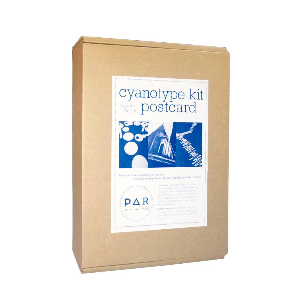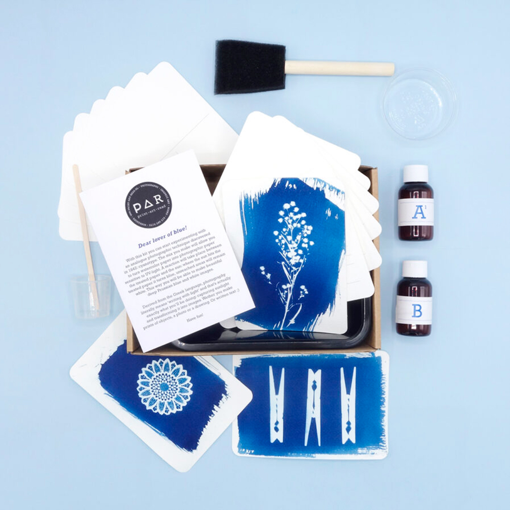 Par Cyanotype Kit Postacard on Tee se itse -syanotypiasetti, jota voit käyttää herkkien, sinivalkoisten printtien tekemiseen kotona ilman pimiötä!