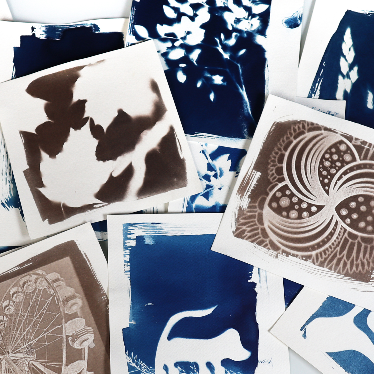 Syanotypia ja Van Dyke ovat molemmat vanhoja valokuvien vedostustekniikoita, joissa luodaan yksivärisiä valokuvia ilman kameraa – lopputuloksena on kauniin preussinsininen (syanotypia) tai seepiansävyinen (Van Dyke) vedos. Jokainen printti on täysin uniikki, ja lopputulos on aina yllätys! Syanotypian keksi tieteilijä John Herschel vuonna 1842. Van Dyke -menetelmän kehittivät Arndt & Troos vuonna 1889, ja se on saanut nimensä flaamilaisen taidemaalari Anthony van Dycken mukaan.